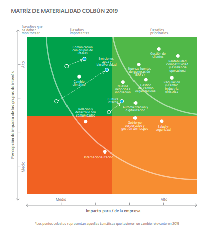 La materialidad de Colbún incluye hoy 73 materias agrupadas en 15 temáticas generales, todos los cuales se ubican en una matriz de materialidad según su grado de relevancia para la Compañía y para los grupos de interés.
